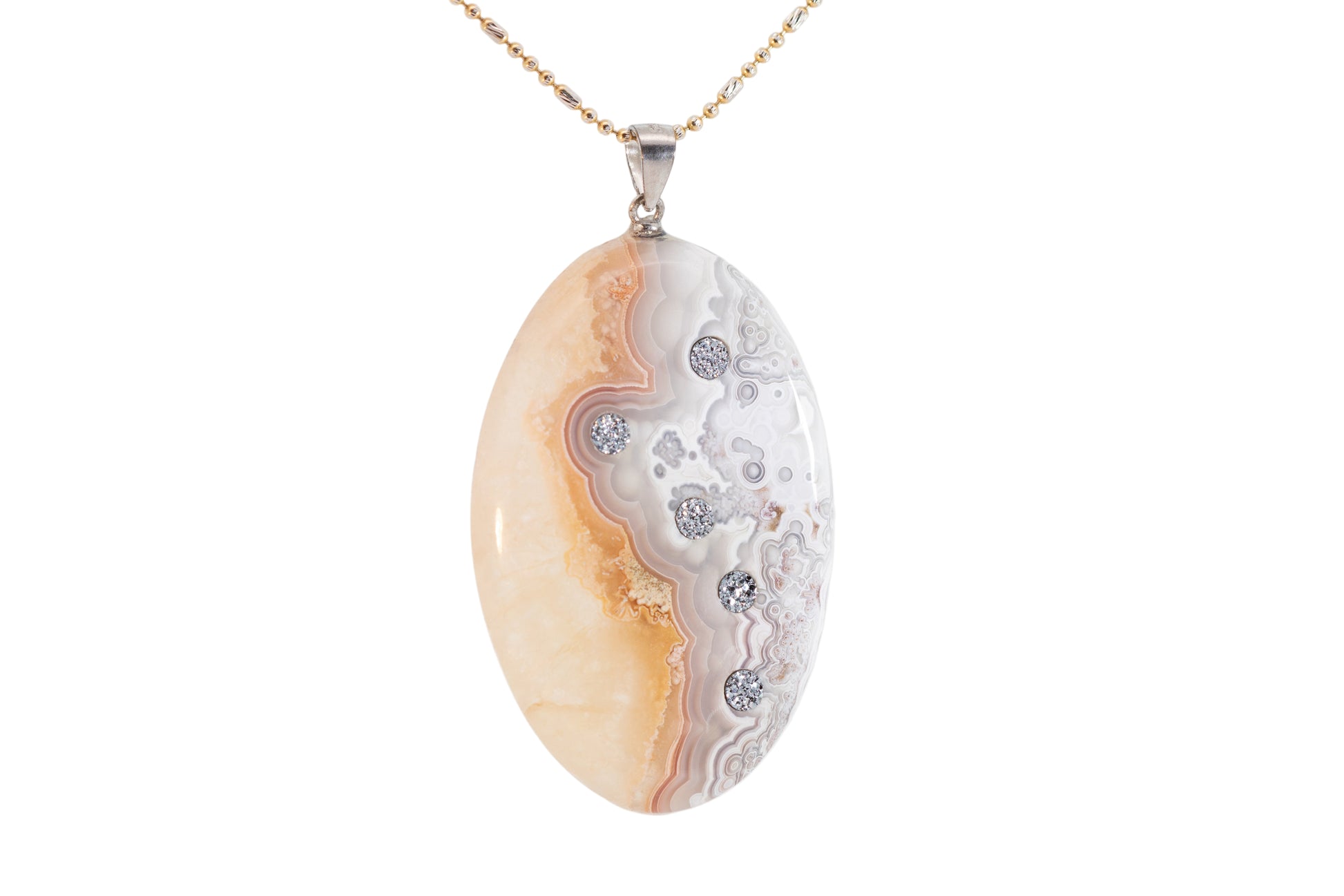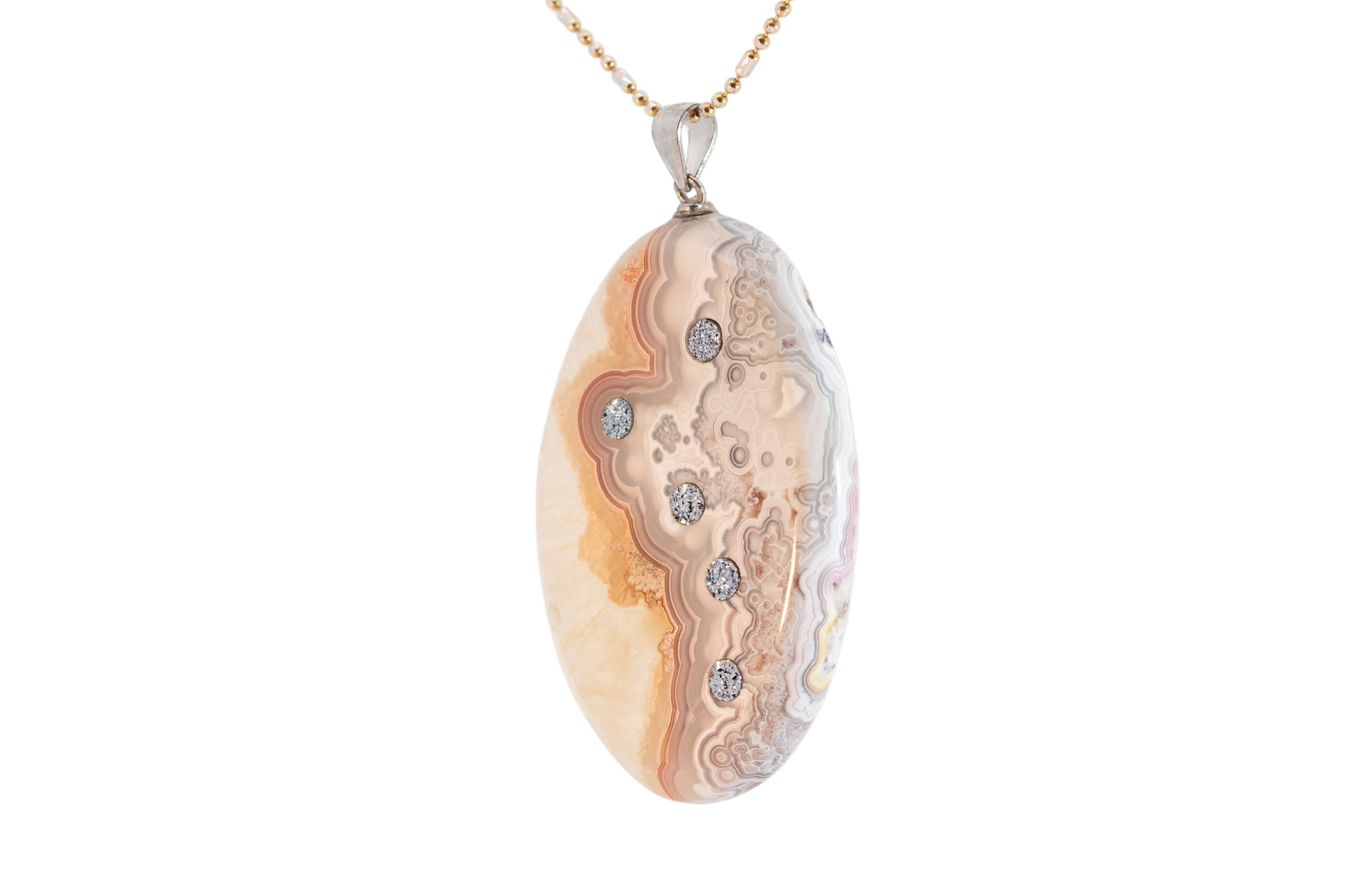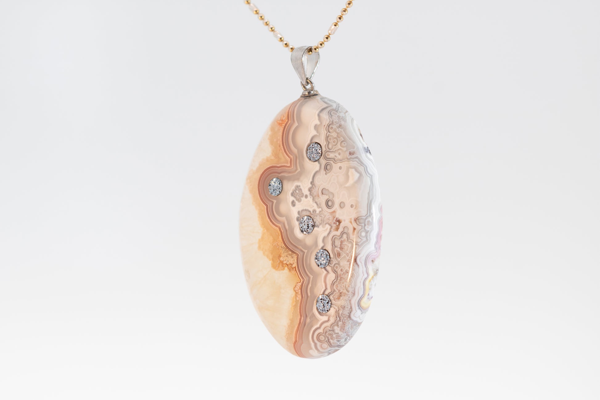 The pendant “5 White”, crafted from fine agate, captivates with its gentle color gradient of creamy white, soft beige, and delicate peach hues merging into subtle gray patterns. Its surface evokes the flowing texture of clouds or sand dunes at sunset.