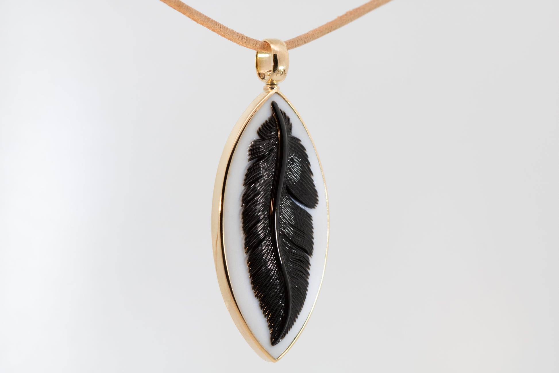 Das Schmuckstück „Black Twin Feather“ verkörpert Stärke, Tiefe und symbolische Eleganz. Die filigrane Feder aus schwarzem Achat steht für Schutz, Beständigkeit und innere Kraft. In ihr eingebettet schimmert der kristalline Osmium-Federkiel – Sinnbild für Reinheit, Ewigkeit und Klarheit.