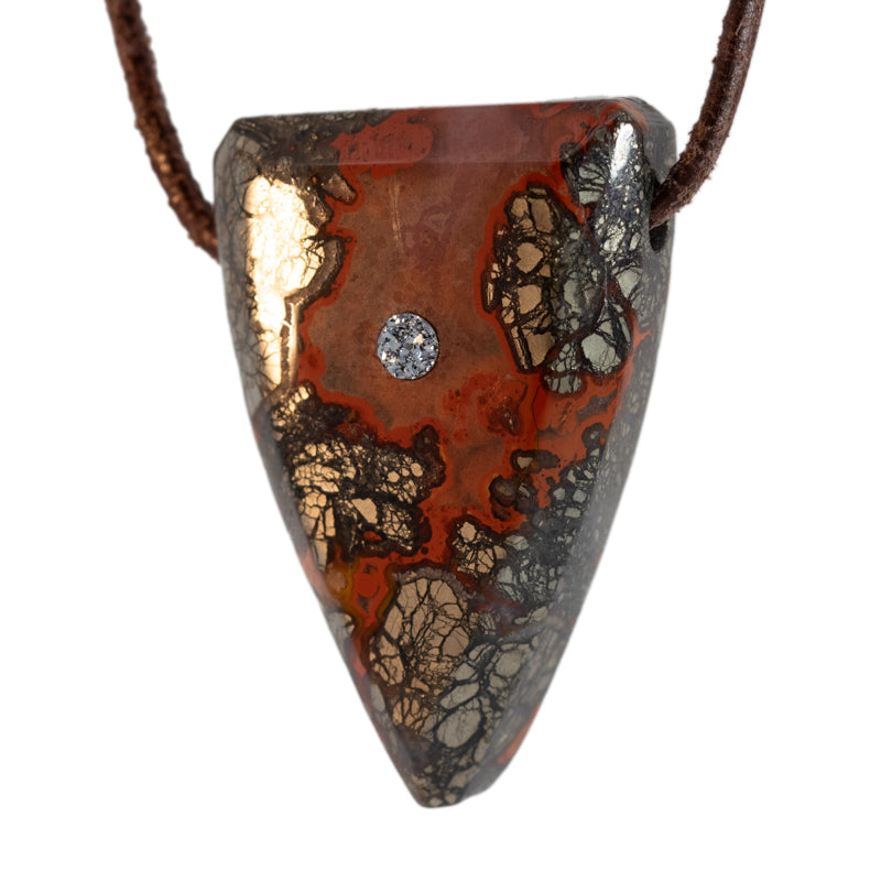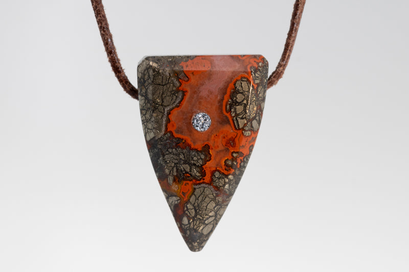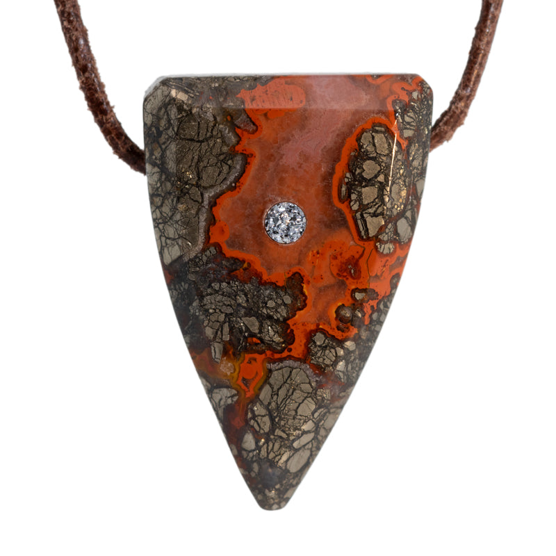 Der Anhänger „Feuerzahn“ aus Achat besticht durch seine markanten Rottöne und Anthrazittöne und erinnert an den Zahn eines Drachen. Verziert mit einem funkelnden Inlay aus kristallinem Osmium, symbolisiert er Kraft, Energie und Feuer.