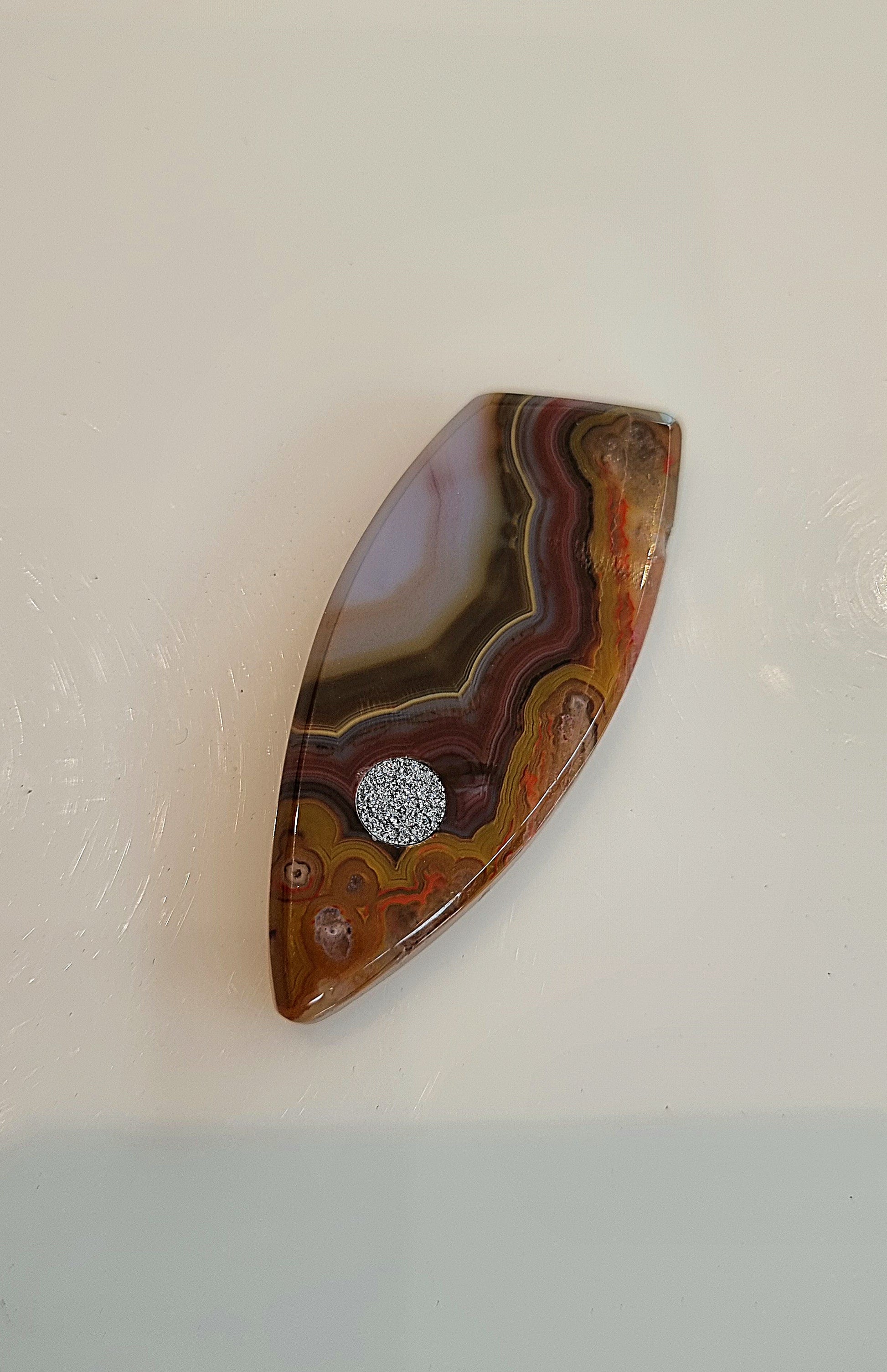 The finely polished surface highlights the vibrant structure of the agate. Set near the base is a round osmium inlay, whose crystalline shine creates a striking, futuristic contrast to the stone’s warm, earthy tones.