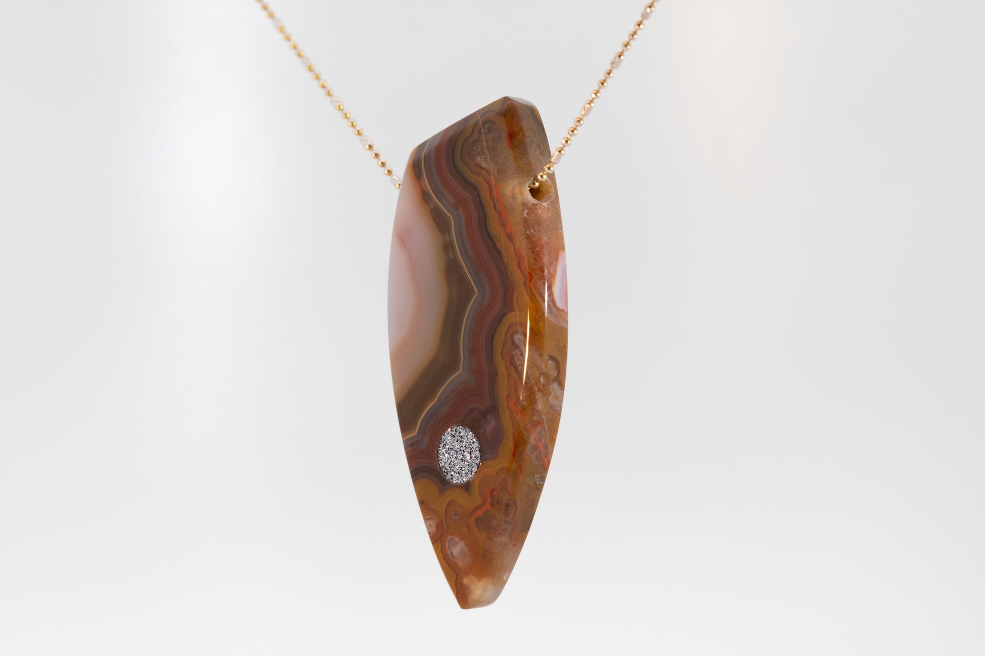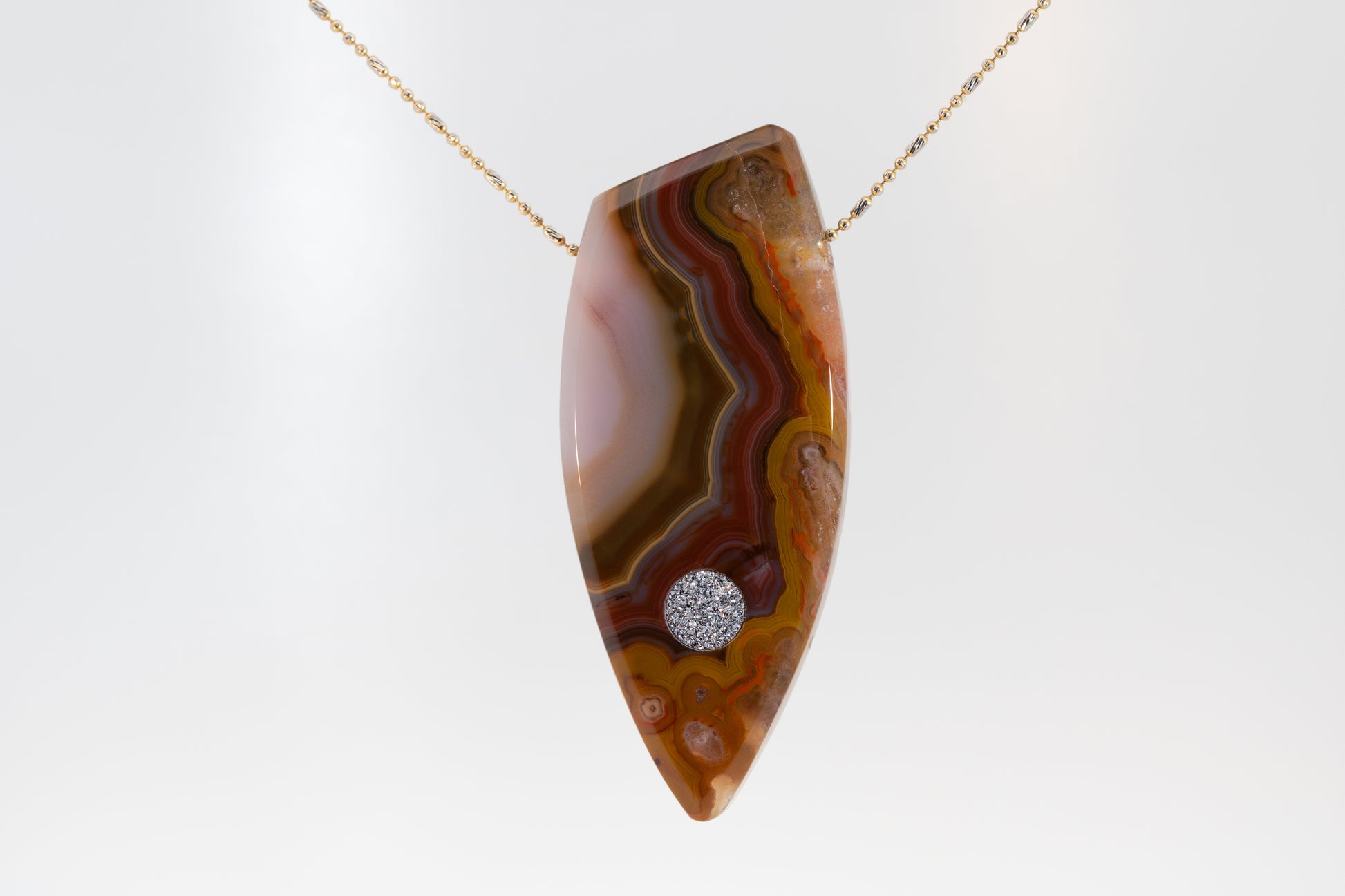 Die sanft polierte Oberfläche bringt die lebendigen Linien des Achats besonders klar zur Geltung. Unten im Anhänger sitzt ein rundes Osmium-Inlay, das mit seinem kristallinen Glanz einen edlen, futuristischen Kontrast zur warmen Erdigkeit des Steins bildet.