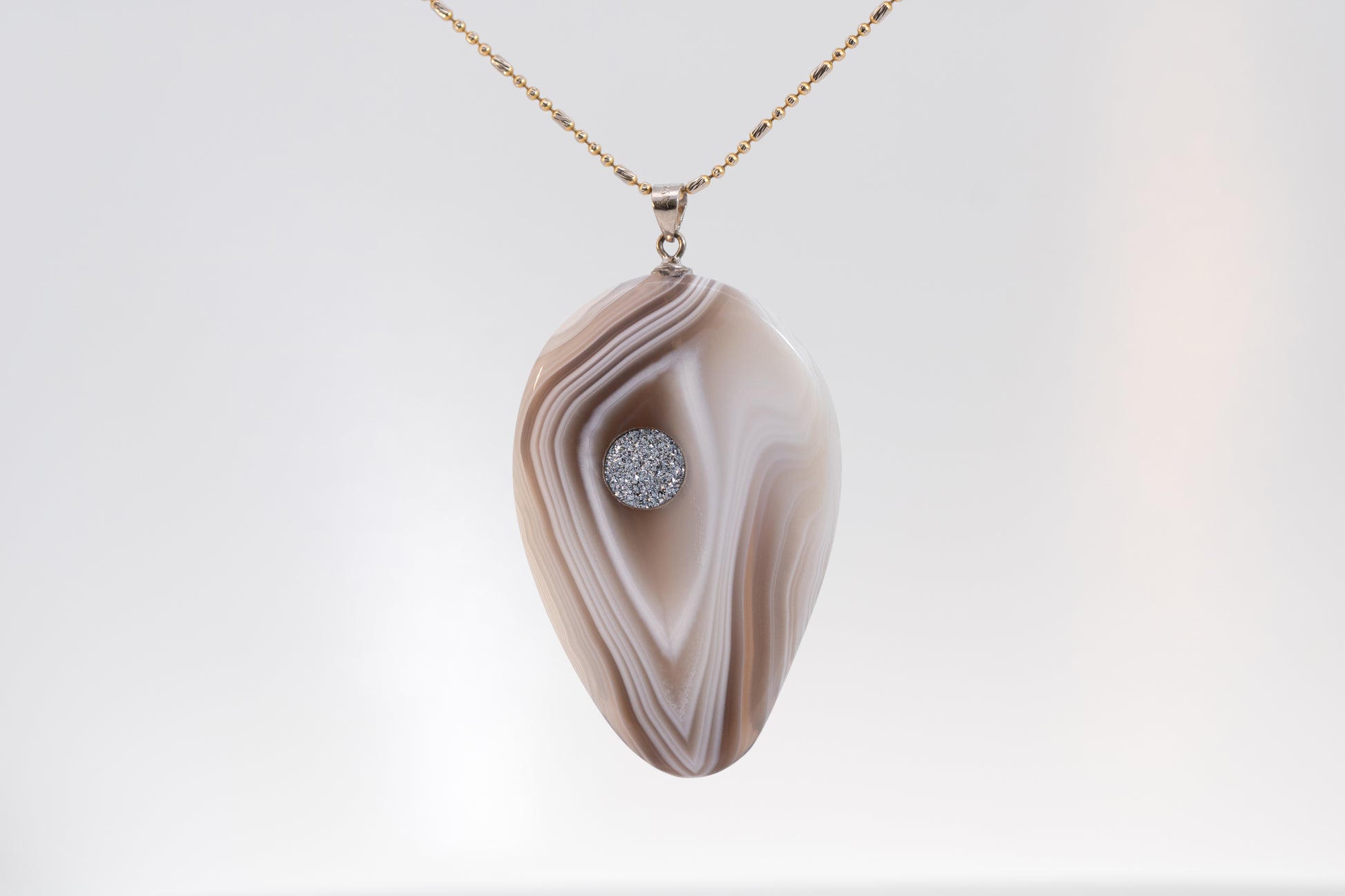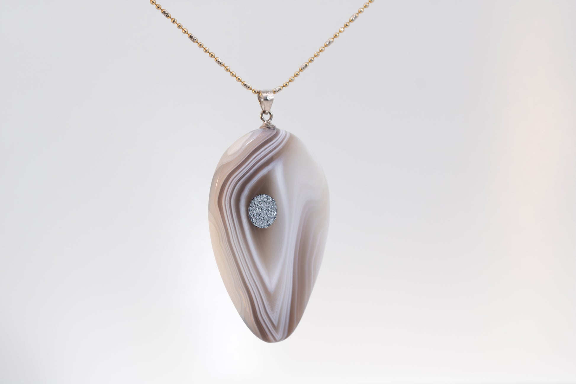 The pendant “Innocence” enchants with its delicate oval shape and soft, almost ethereal color palette. Gentle shades of white and grey blend seamlessly, interwoven with thin grey lines that add natural depth and lightness to the agate. The smooth transitions and calm pattern give the piece a sense of purity, subtlety, and quiet elegance, perfectly matching its name.