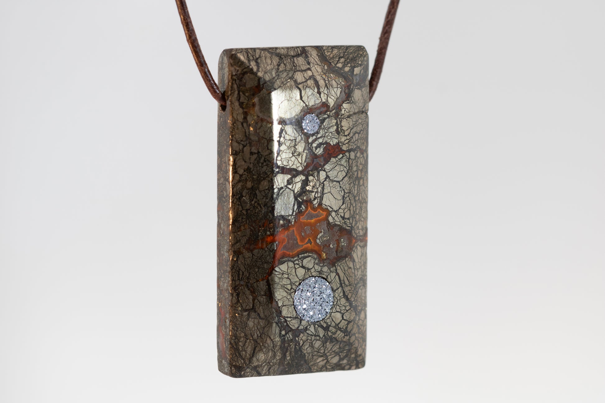 The pendant "Odyssey" made of dark agate appears futuristic due to its shape and the anthracite-colored surface that carries a hint of red. It has been refined with two inlays made of crystalline osmium and symbolizes strength and faith in oneself.