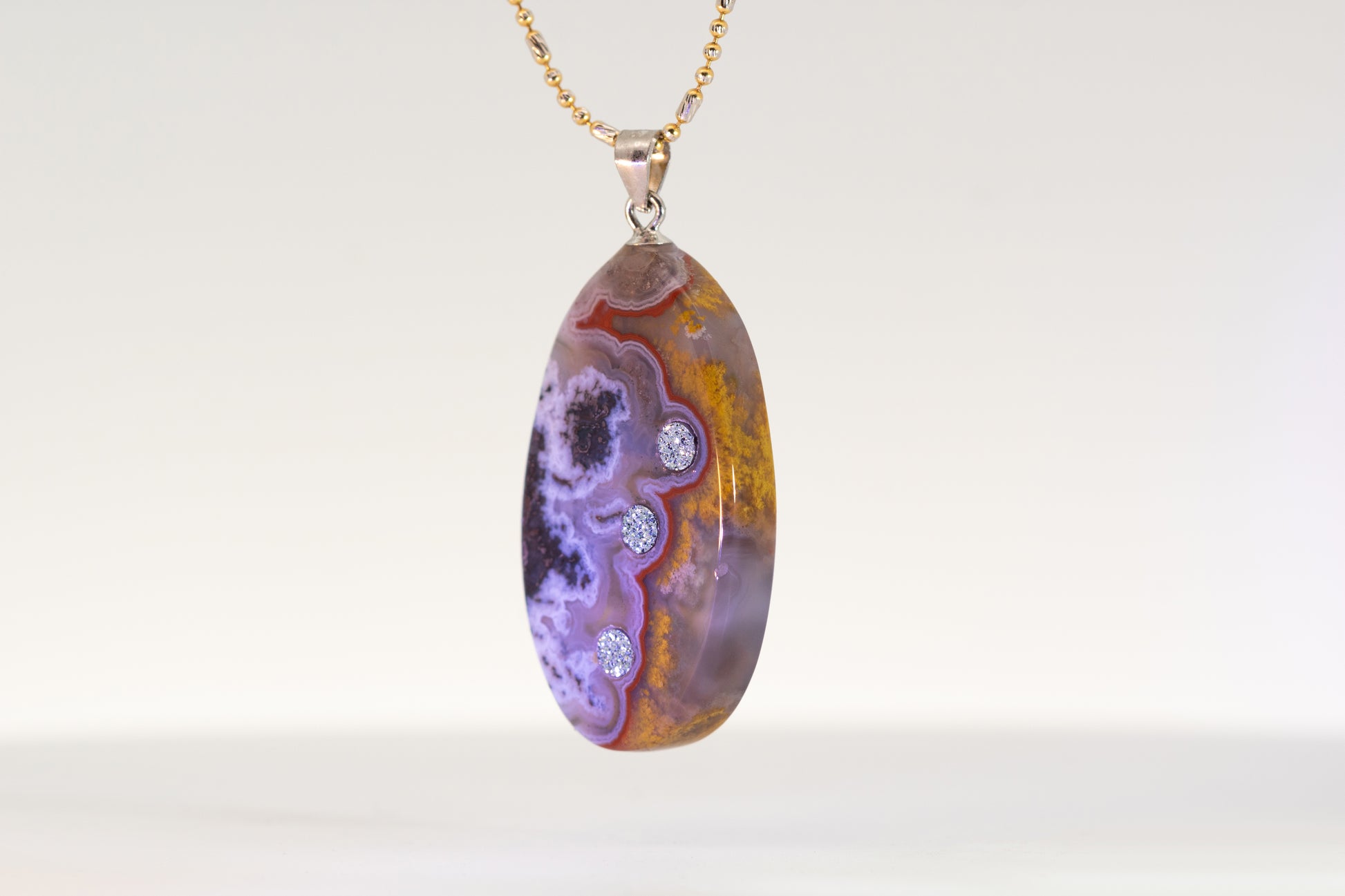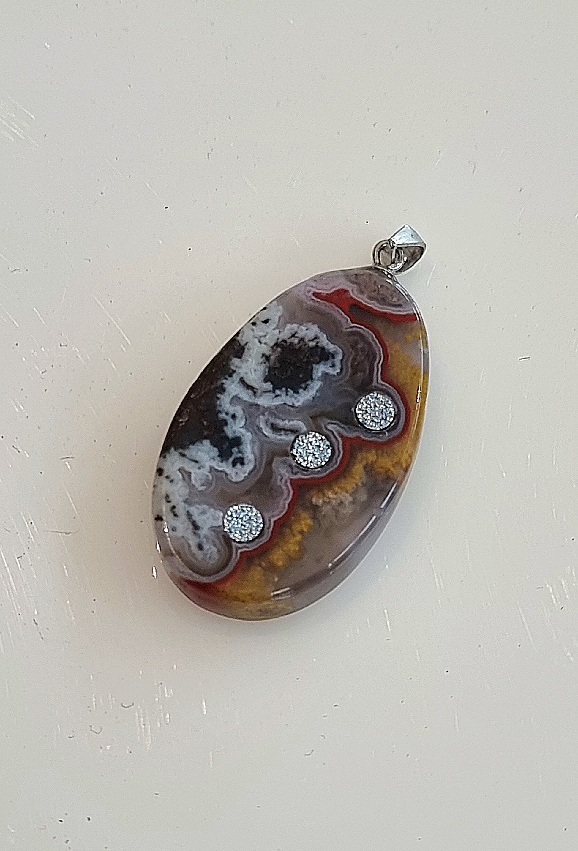 Besonders auffällig sind die wolkenartigen Muster im Inneren des Achats, die an Naturformationen erinnern und dem Anhänger eine fast malerische Ausstrahlung verleihen. Drei funkelnde Osmium-Inlays setzen elegante Glanzpunkte und harmonieren wunderschön mit den kräftigen Farbübergängen.