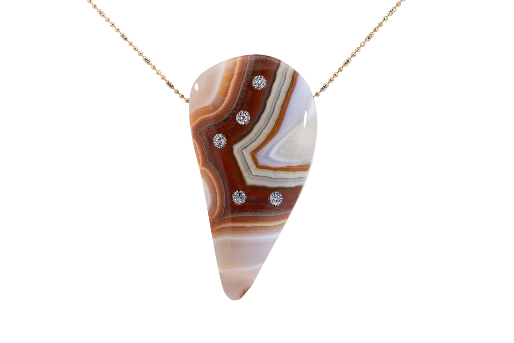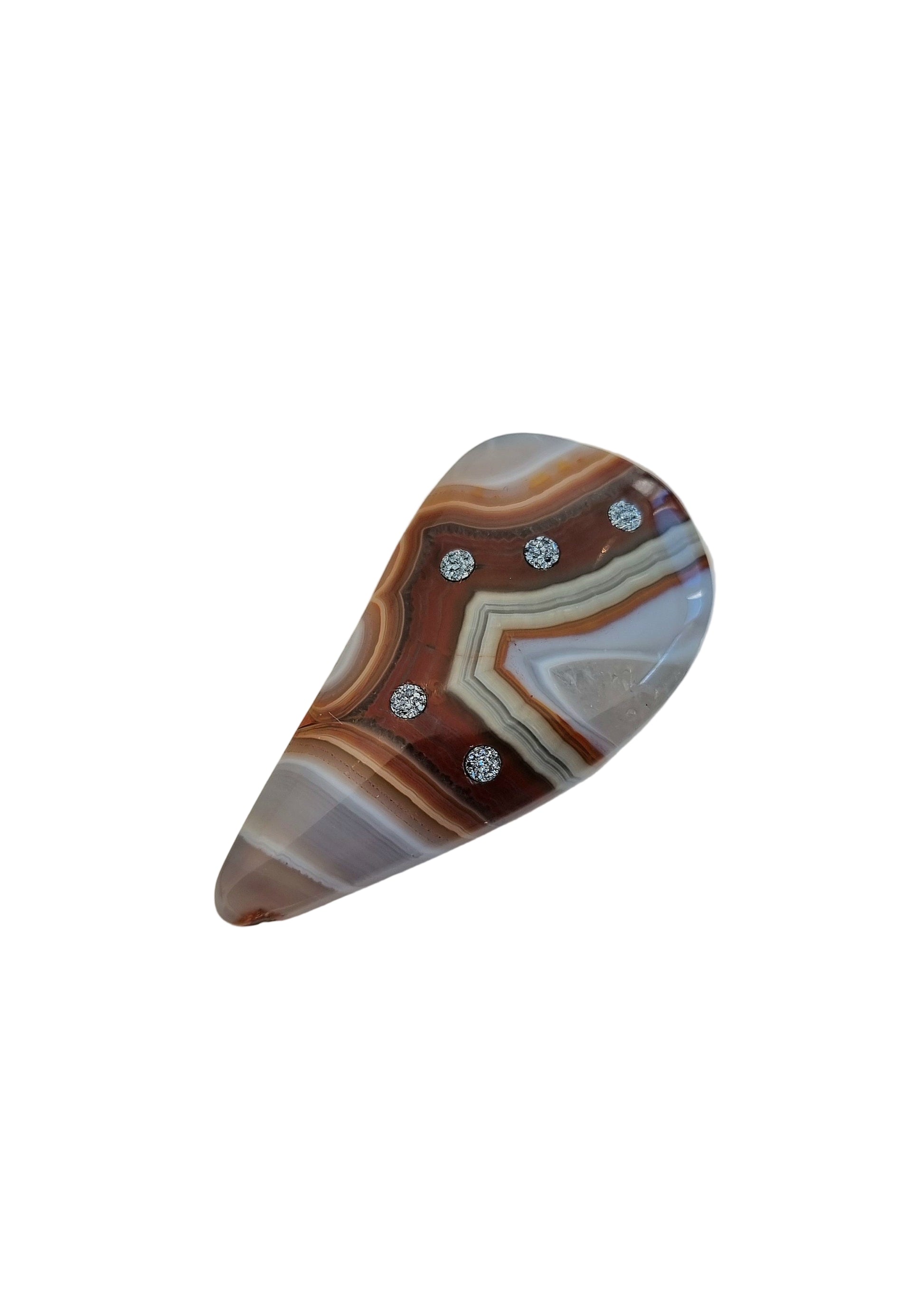 The pendant “Stoney Beauty”, crafted from exquisite agate, captivates with its striking pattern of rich red, brown, and creamy hues. The fine layers of the stone resemble the natural strata of the earth – organic, powerful, and full of depth.
