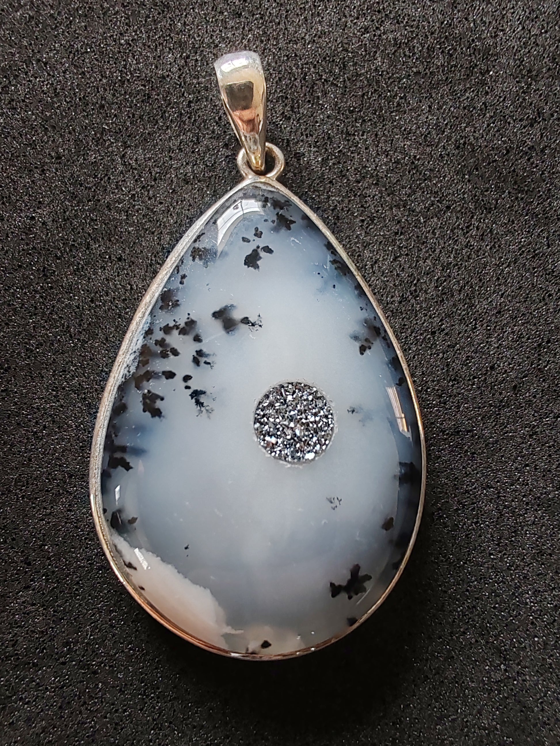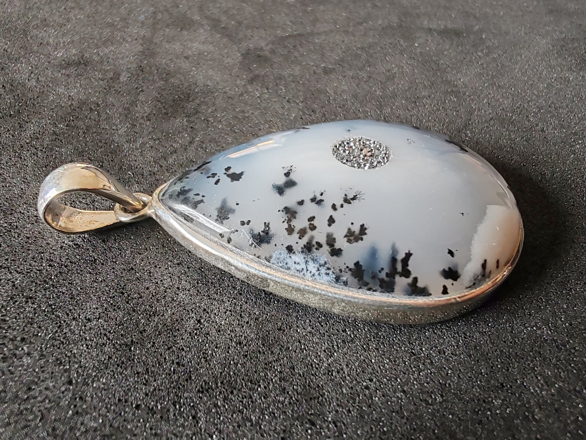 Aurora – a masterpiece that captures the magic of the first rays of sunlight and embodies the beauty of new beginnings. At its heart lies a 6 mm osmium inlay, symbolizing eternity and immortality – sparkling like a cosmic gateway of stars. Framed in noble Sterling Silver, it rests within the white dendritic agate, whose natural patterns resemble mysterious landscapes. This union of earthly grounding and celestial brilliance creates a harmony that radiates both protection and inspiration. Aurora is more than jewelry – it is a powerful symbol of light, hope, and the infinite elegance of life.