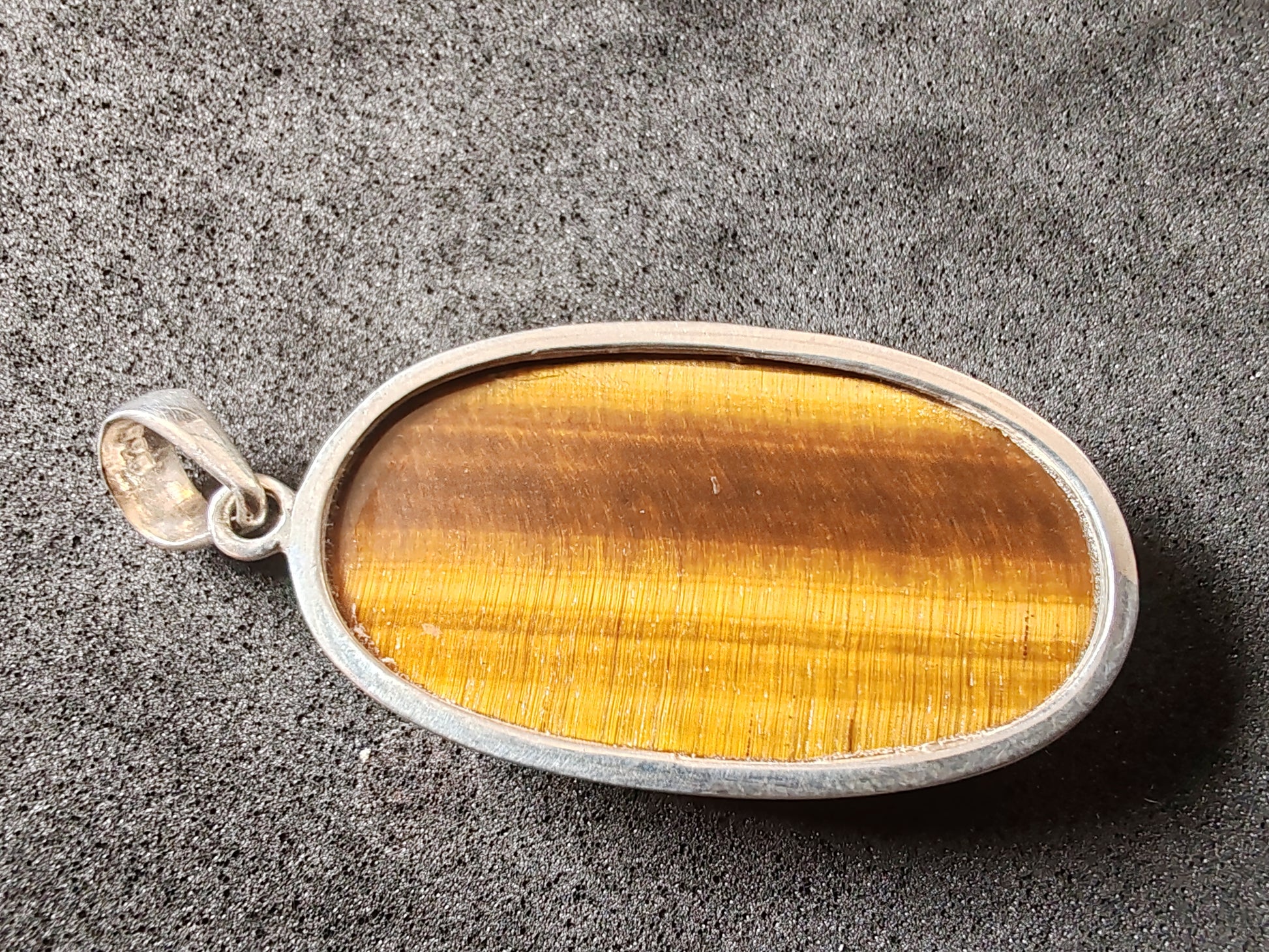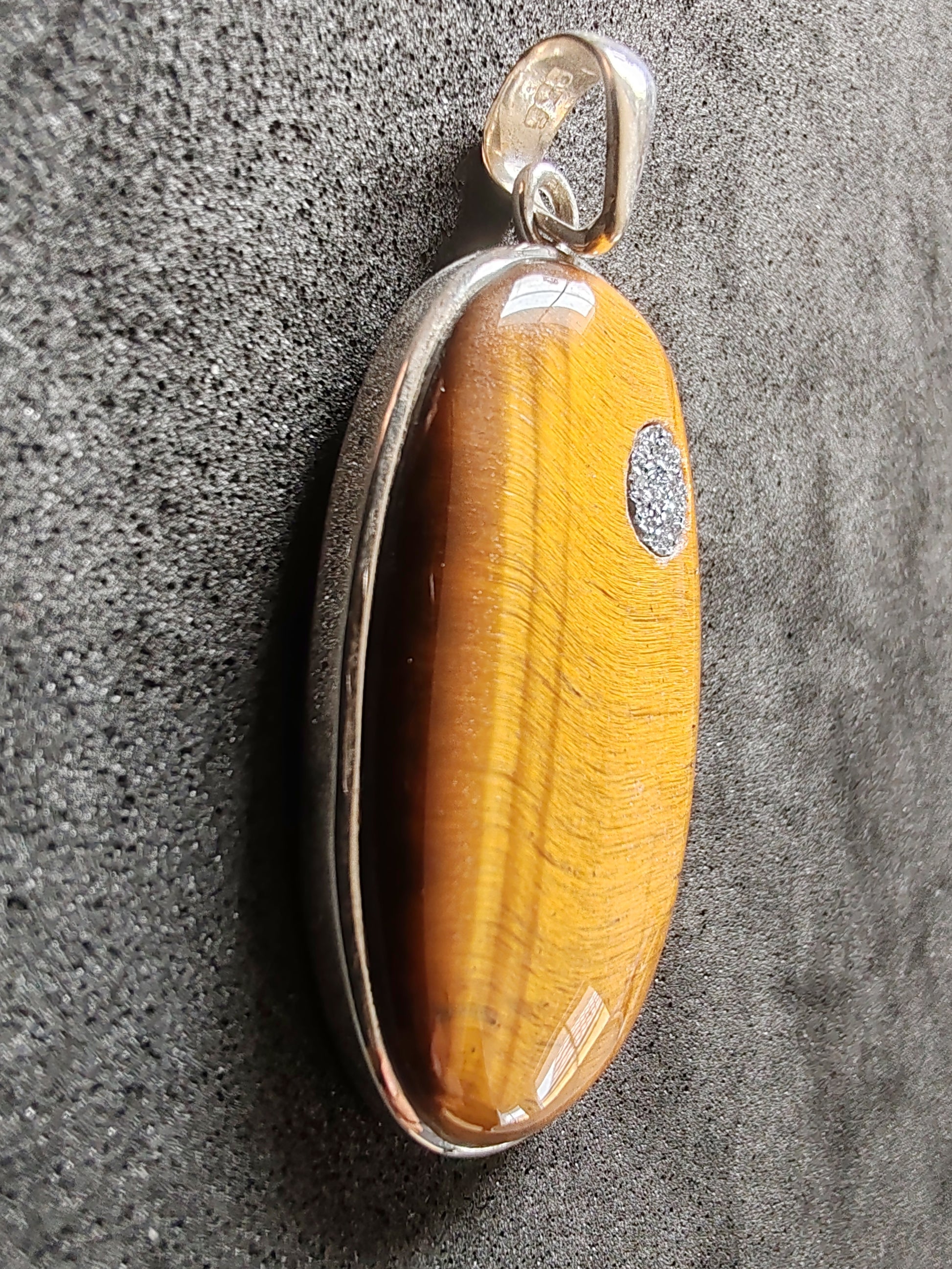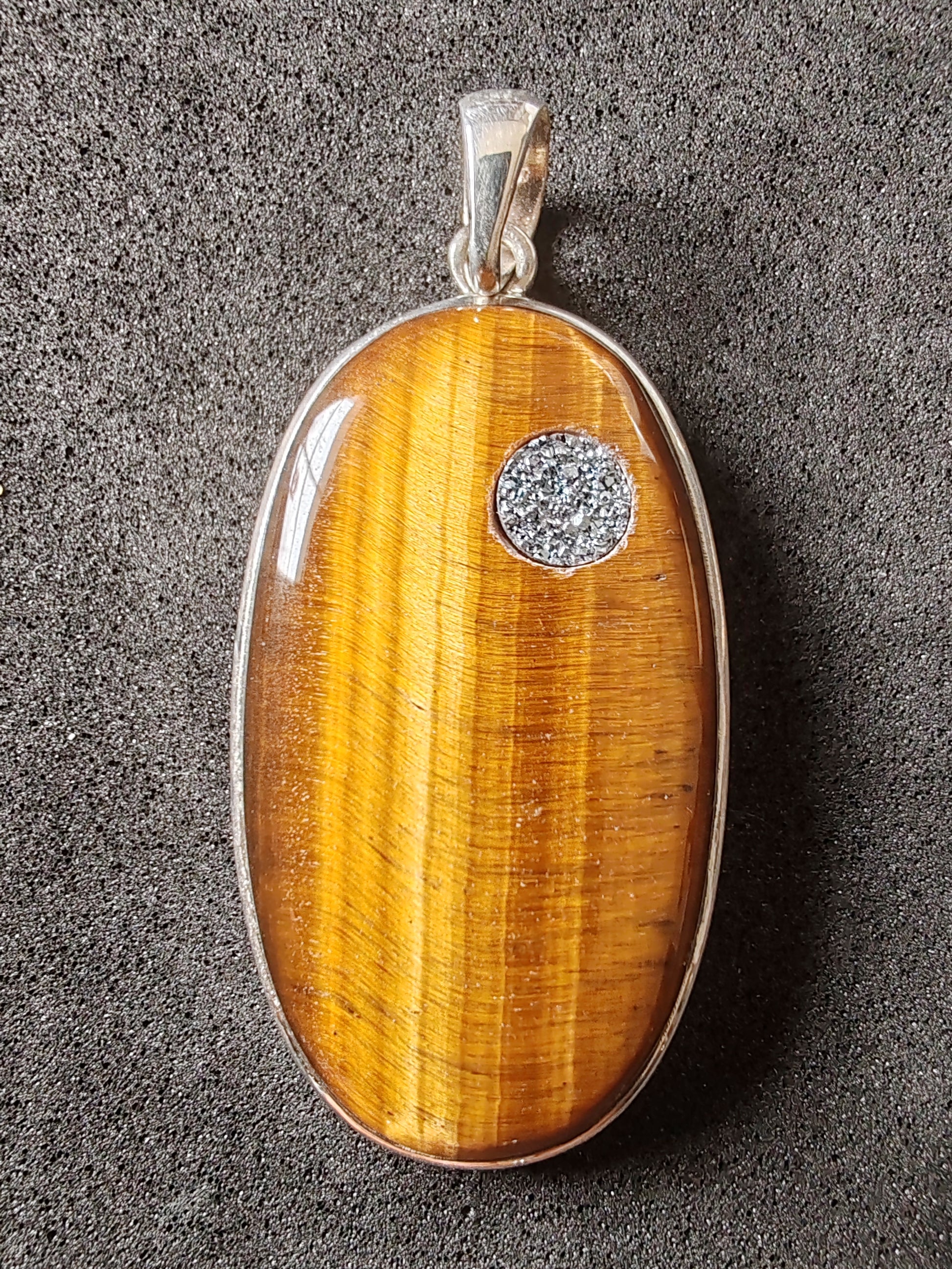 The “Eye of the Tiger” unites the grounded power of golden shimmering Tiger Eye with the eternal brilliance of a sparkling Osmium inlay. Set in refined Sterling Silver, this pendant radiates strength, protection, and timeless luxury. Tiger Eye has long been cherished as a symbol of inner clarity and focus, while Osmium – the rarest precious metal on Earth – embodies eternity and cosmic energy. Together, they create a jewel that anchors the soul while opening the gaze to the universe. An exclusive statement piece for those who express their inner strength with elegance.
