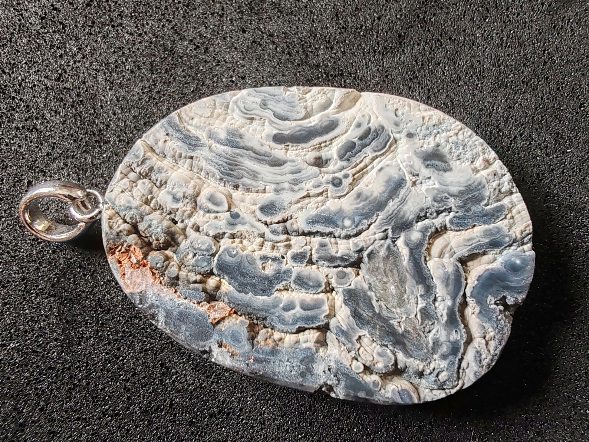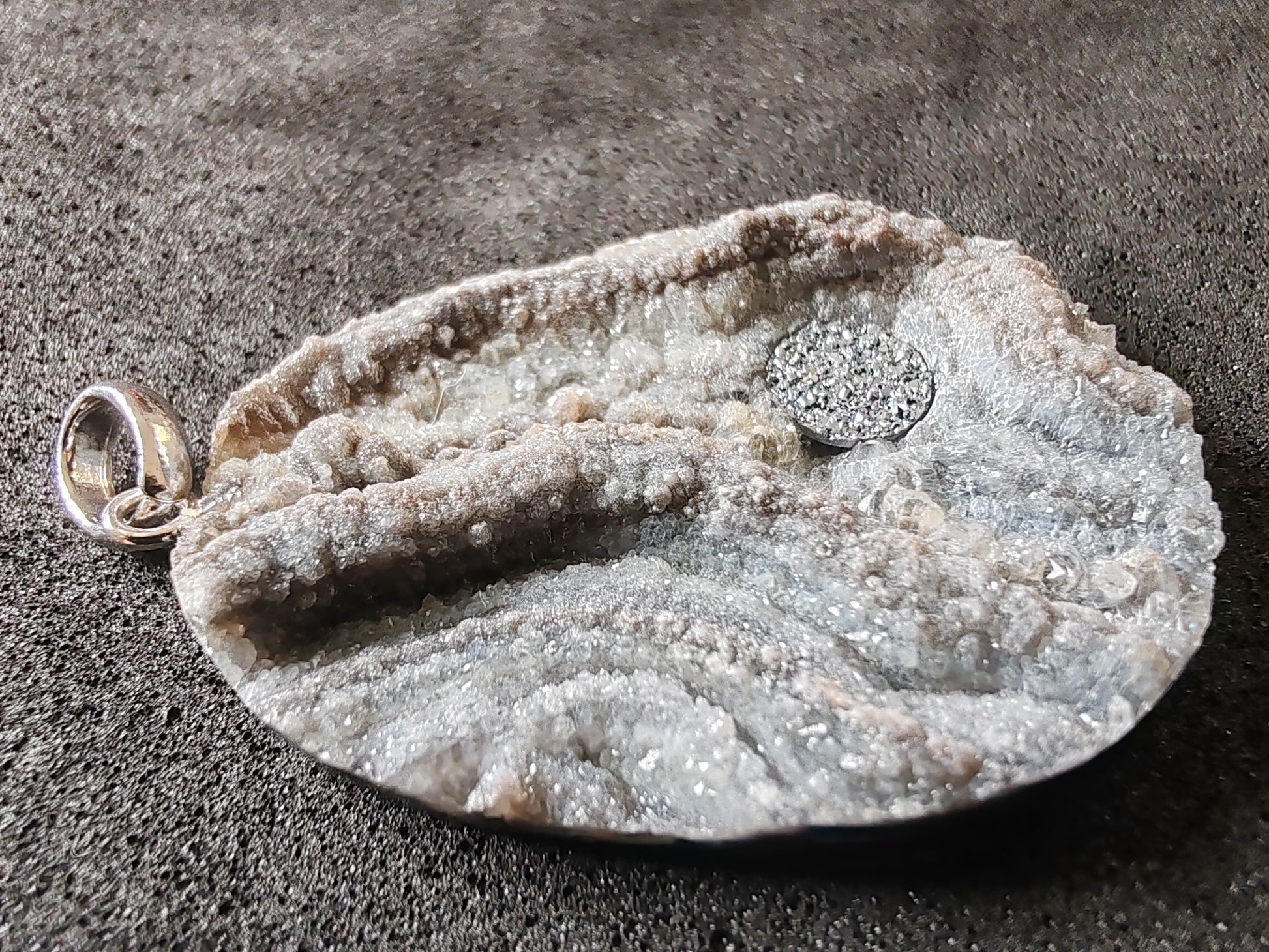 A mysterious treasure of nature reveals itself in this pendant: shimmering druzy agate in soft shades of grey and taupe embraces a sparkling osmium disc, shining like a hidden pearl. Its crystalline surface evokes the protective shell of an oyster, concealing a precious secret within. Completed with a refined Sterling Silver bail, this creation unites the strength of the depths with the elegance of timeless beauty. “Secret Pearl” embodies protection, inner wealth, and the magic of hidden wonders – an exclusive statement piece for those who desire the extraordinary.
