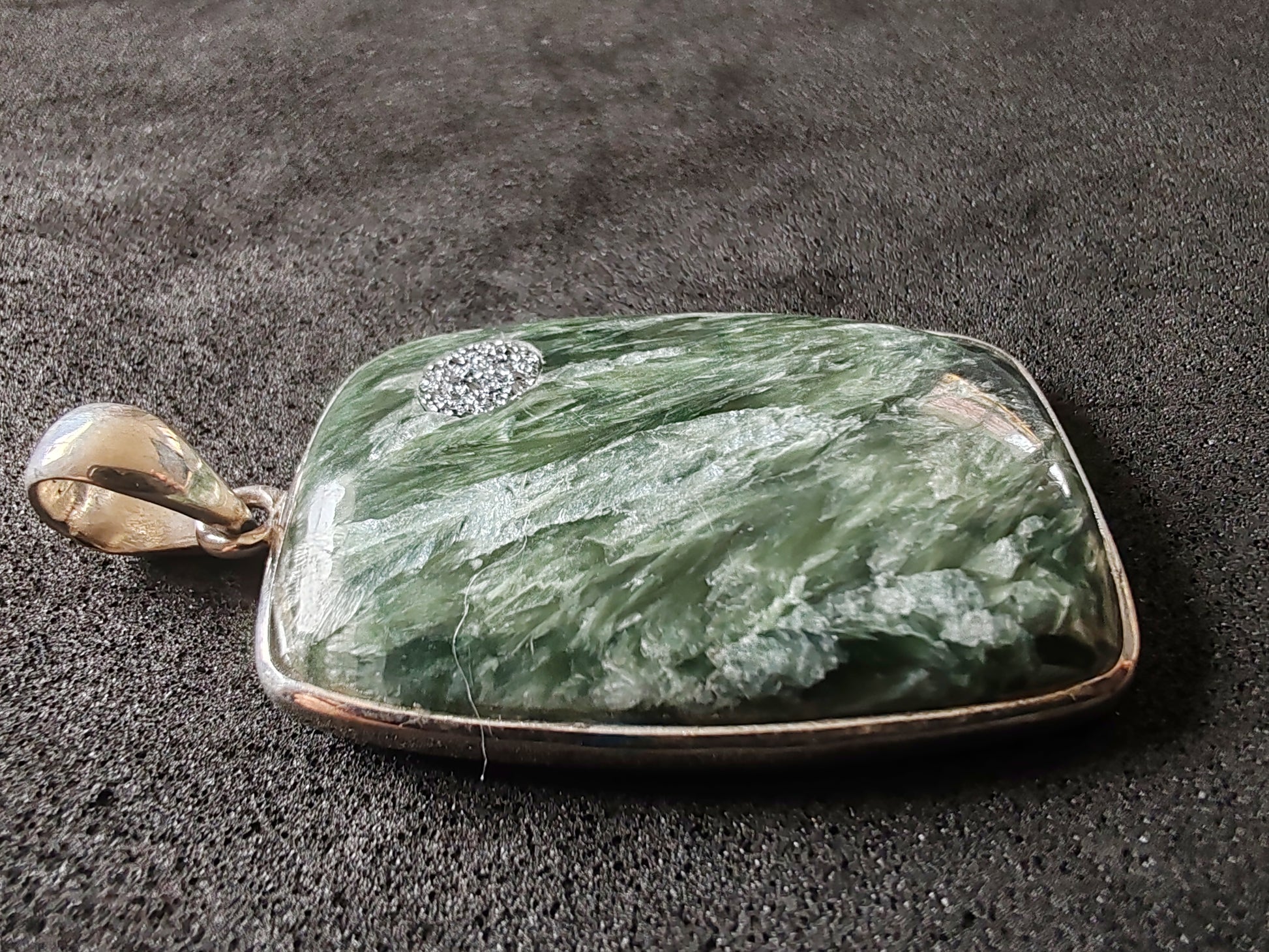 “Verde Luce” combines the power of nature with cosmic brilliance. The deep green Seraphinite, known as the Angel Stone, symbolizes healing, protection, and inner peace. The embedded Osmium inlay, the rarest precious metal in the world, sparkles like a star – turning this jewel into a symbol of harmony, elegance, and timeless strength.