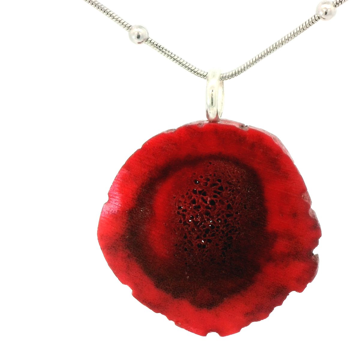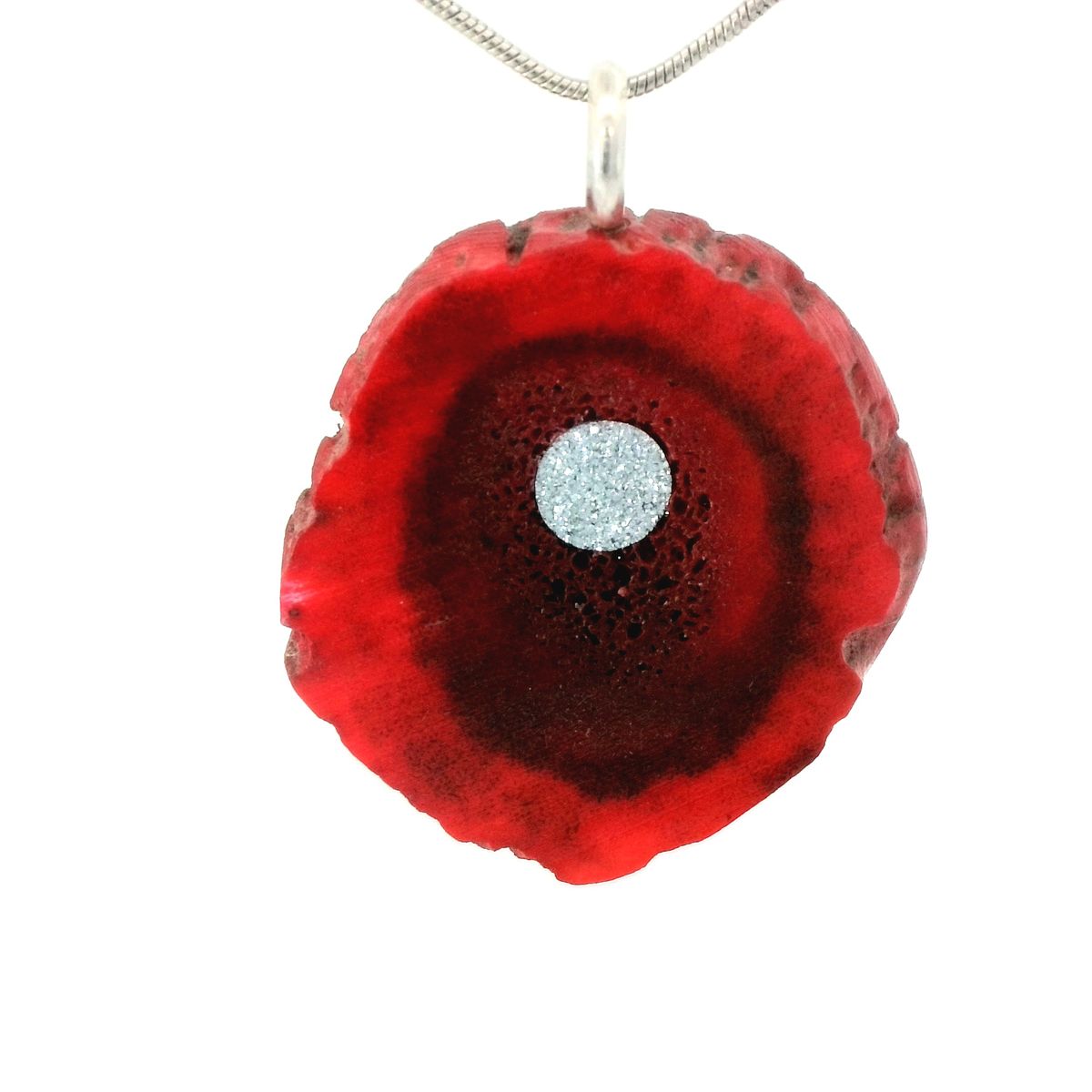 Der Anhänger "Rotella" aus gefärbtem Horn gefällt durch sein leuchtendes Rot, das sich zum Rand hin noch verstärkt. Er wurde mit einem großen Osmium Inlay veredelt und steht für die Liebe und Herzenswärme.