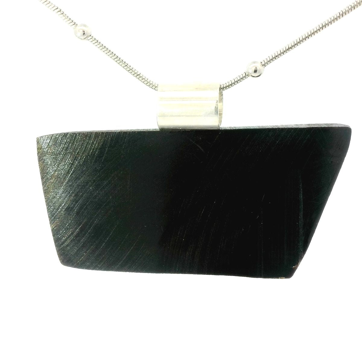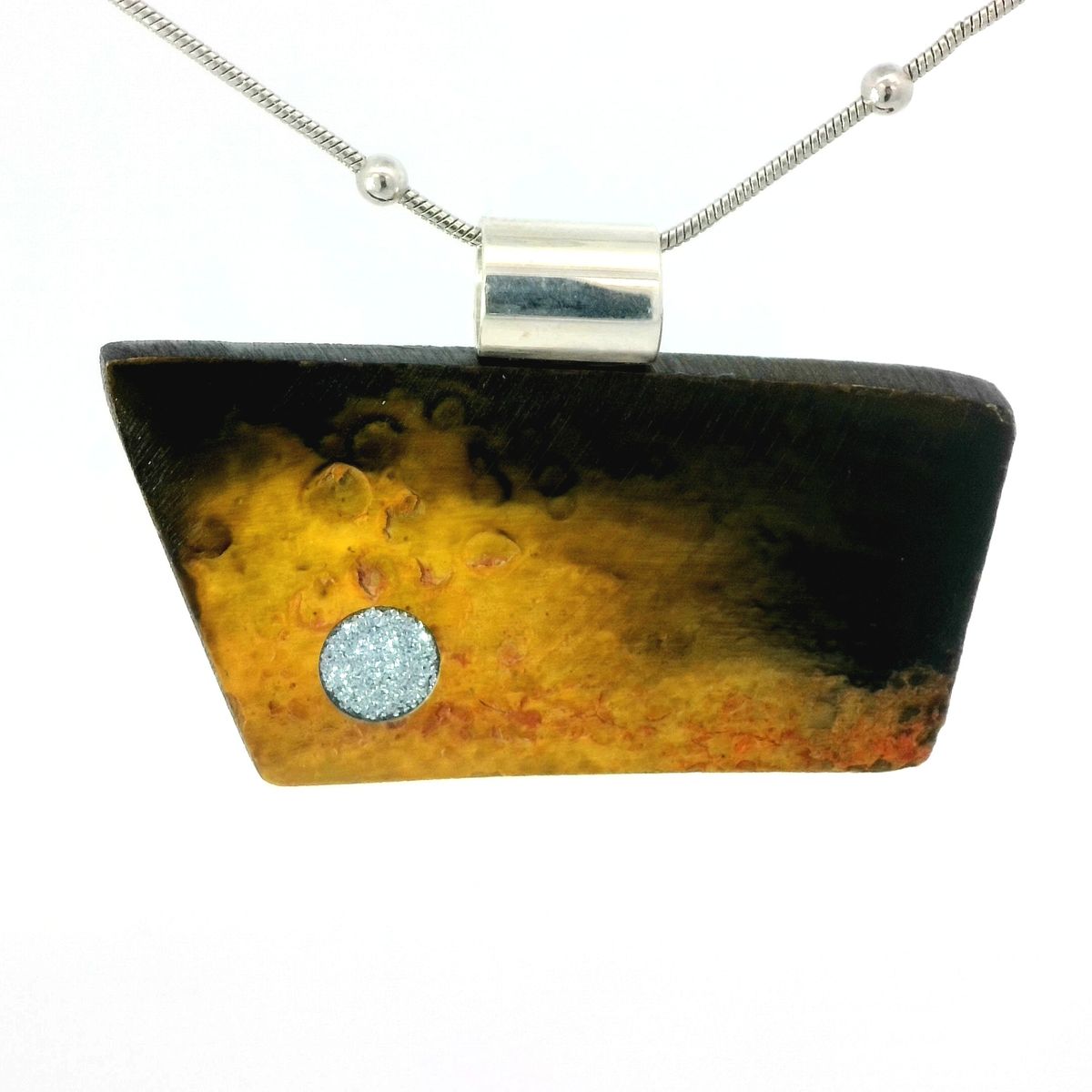 The pendant “Sunset”, crafted from horn, reflects the colors of the setting sun as dusk begins to fall. Adorned with a single sparkling crystalline osmium inlay, it symbolizes warmth, transition, and tranquility.