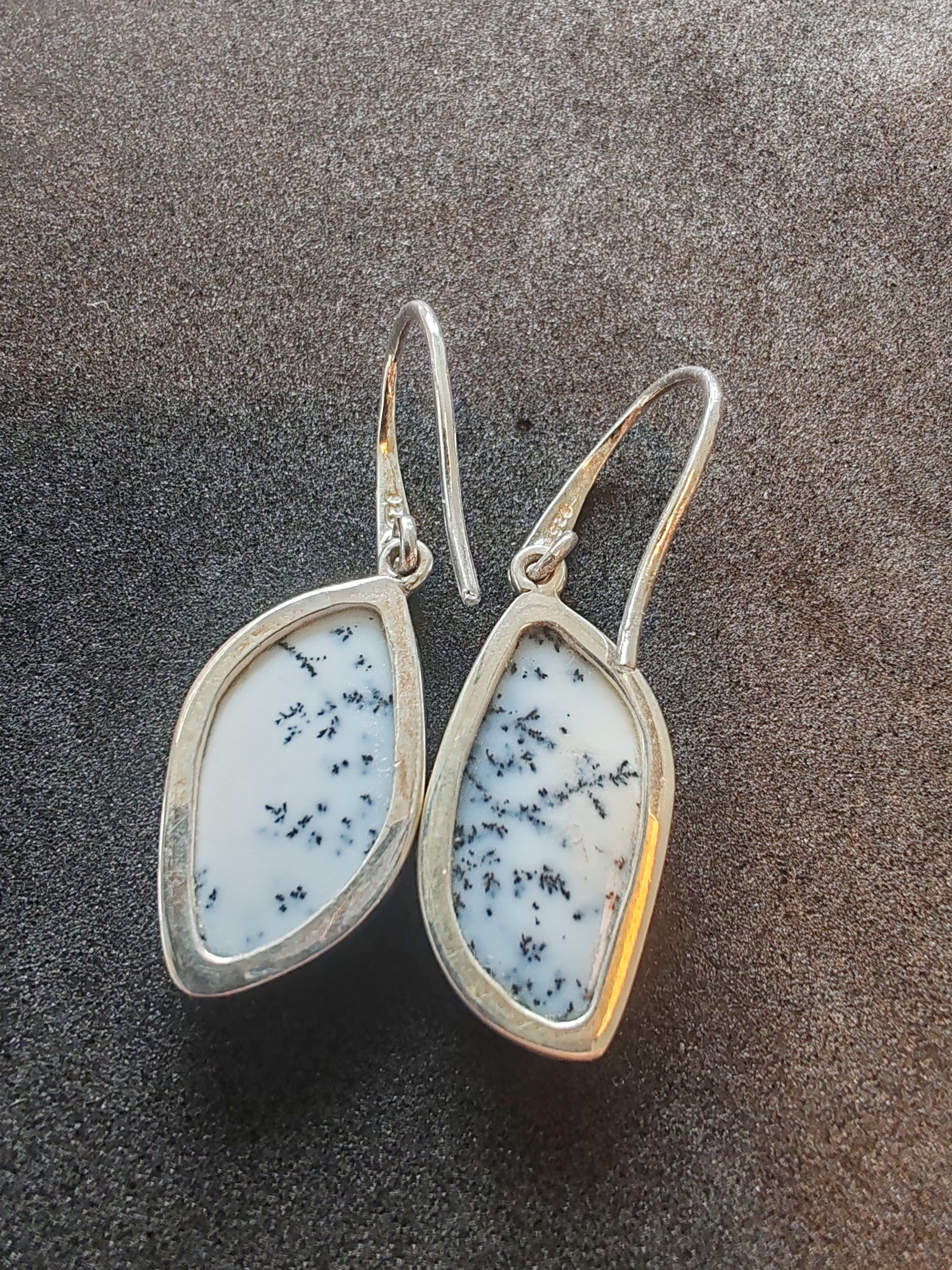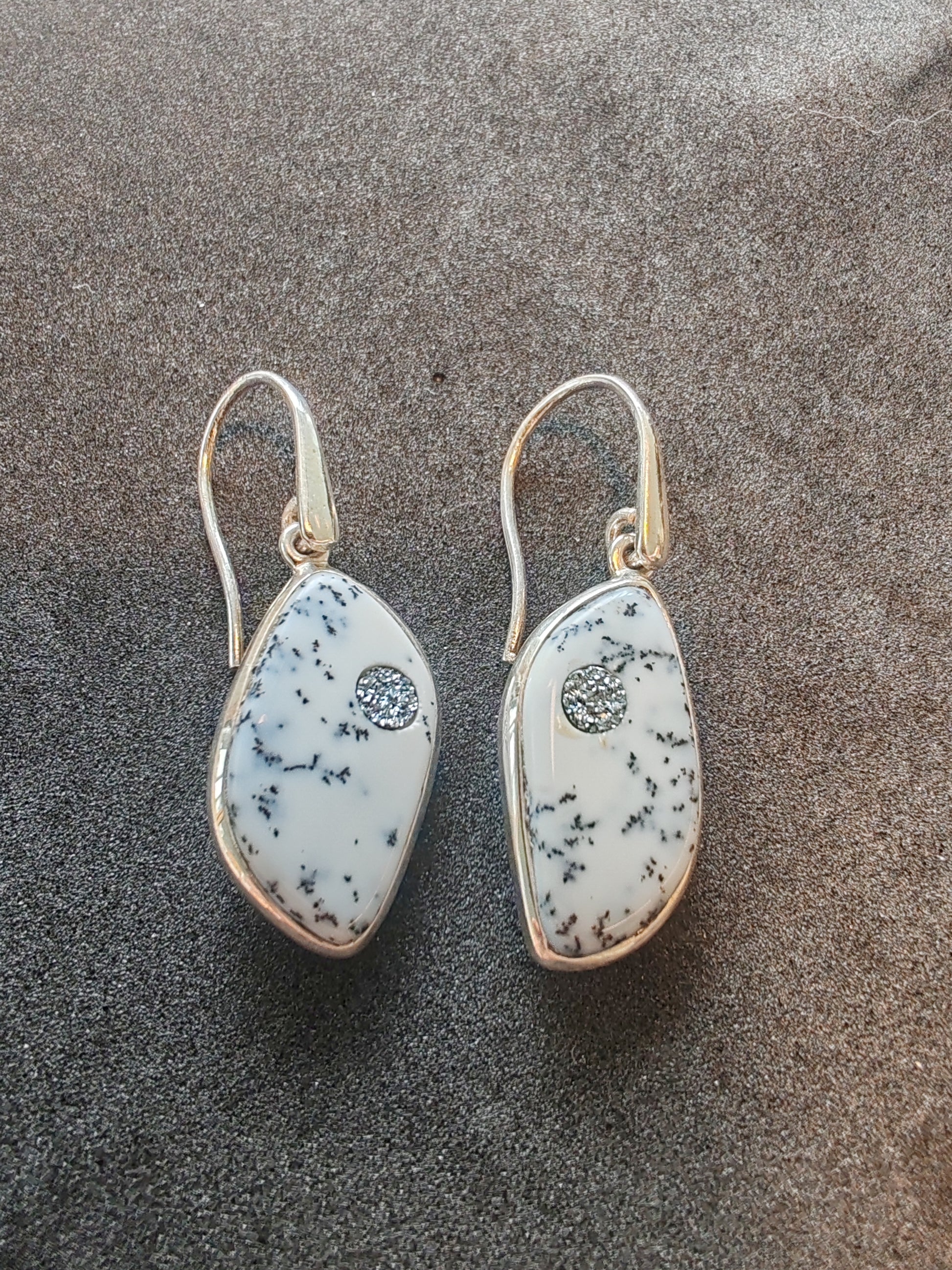 The “Snow Blossom” earrings combine the delicate beauty of white dendritic agate with its fine, blossom-like inclusions and the timeless sparkle of crystalline osmium. Set in elegant Sterling Silver (925), these earrings shine like frozen snow blossoms – a symbol of purity, nature, and everlasting elegance.